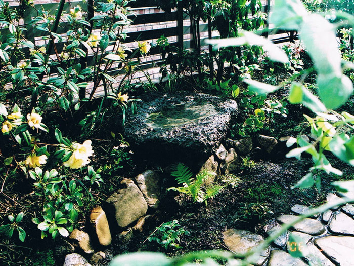 川で遊んでいる時にひろったコンクリートガラを水鉢に加工 黄色い花はシャクナゲ、サフロンクイーン