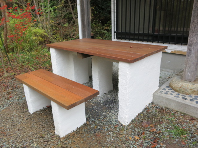 テーブルの土台はブロックを積んで左官仕上げ。