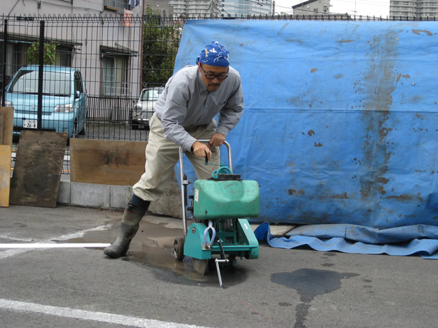 慣れない道具に奮闘中!! アスファルトにカッターを入れます。